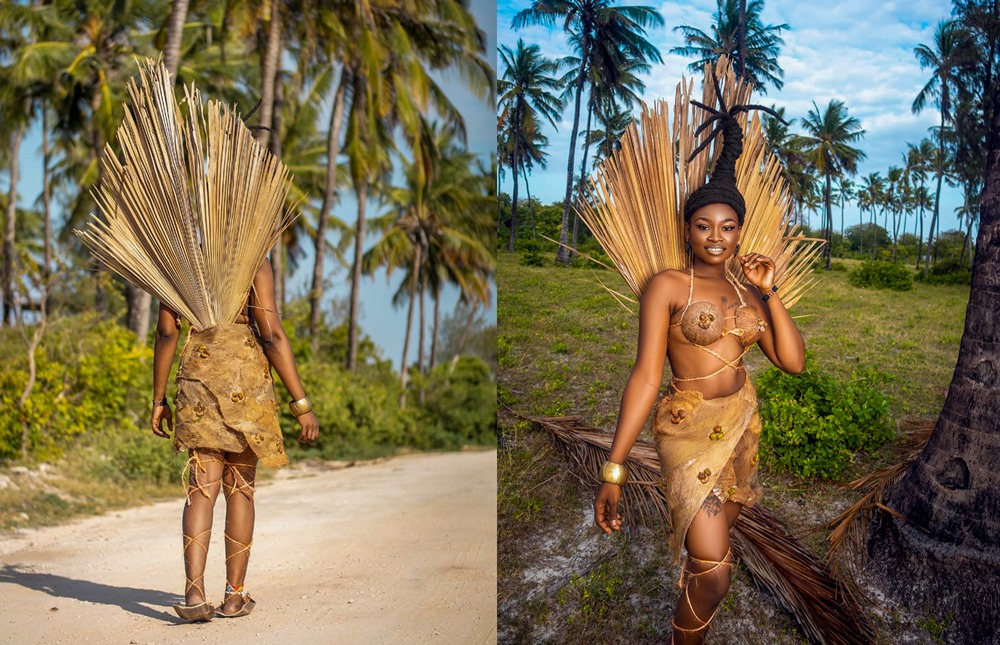 When the designs are complete, she models them herself or works with other models, photographers, and stylists. Many of her most notable works are national or cultural costumes tailored for beauty pageants—bold, statement-making pieces that combine traditional African aesthetics with modern, eco-conscious themes.